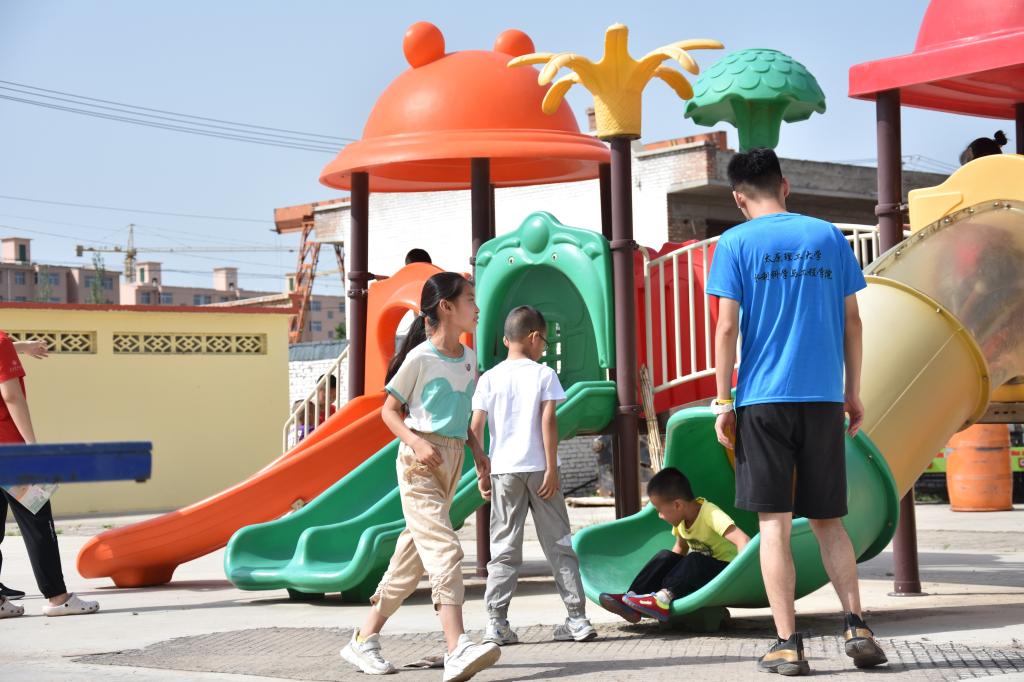 8日上午8点,实践队队员已准备就绪,在当地村委会等待各位家长与学生的到来。此次教学分别在五寨村的新旧村委会设有两个教学场地,将学生分为低年级组和高年级组两个班级开展教学:实践队员贴心地为孩子们准备了水利学院团徽作为见面礼,希望孩子们可以立意高远,心怀鸿鹄之志。上午的教学主要为语文、数学、英语、美术等方面的指导,实践队员以严谨之精神,细心之态度,生动之语言,耐心之教导,为孩子深入浅出地讲解教学,并辅以适当延伸,在夯实知识的基础上,开阔孩子们的眼界。孩子们对世界充满了好奇和渴望,清澈地眼眸里满是求知的欲望。下课时间,孩子们在院子内放松身心,奔跑、跳跃、滑滑梯,挥洒汗水、彰显青春活力。