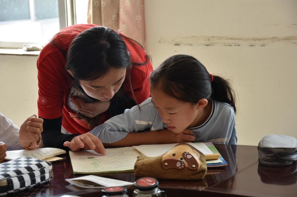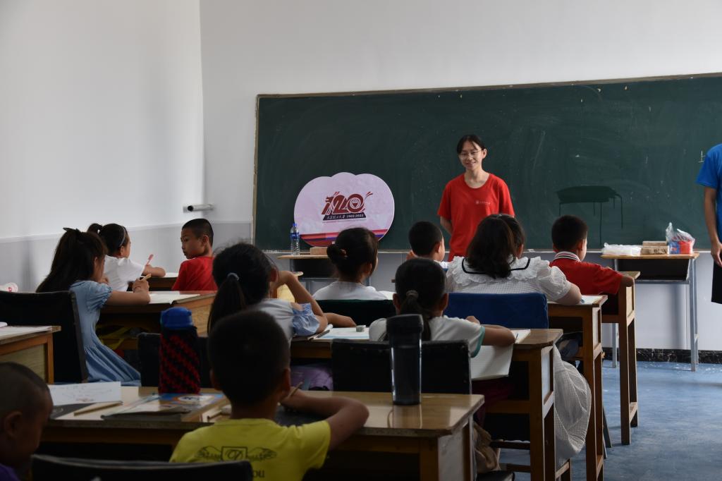 来到教室里面,只见实践队员们有的拿着课本在向小朋友们讲解着数学题,认真的样子十足像一位老师。而孩子们坐在旁边认真好奇地听着老师讲的每一句话,待老师提问问题或者给小朋友们布置学习任务时,大家又是非常积极踊跃地回答。有的实践队员给小朋友们科普有趣好玩的知识,比如为什么海水大多是蓝绿色的、蝉为什么会蜕皮、蜜蜂怎样酿蜜、为什么蛇没有脚都能走路等等,一个个引人入胜的“冷知识”激发了孩子们对这个世界的好奇心,增强了孩子们的求知欲,让孩子们在轻松愉快的环境中学到一些课本中涉及不到的知识。