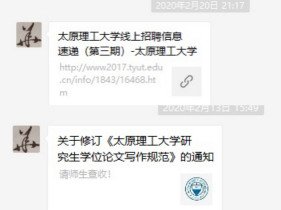 在疫情防控期间,学校和研究生院关于研究生的科研管理工作均做出重要指示,包括延期开学通知、体温日报、网络授课及研究生论文指导等。为更好配合学校工作,作为研究生教育的第一负责人,在收到重要文件通知后,第一时间在微信群中向学生发布,做到信息及时共享。