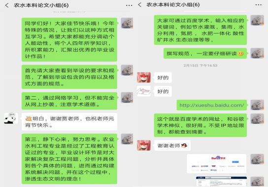 工科毕业论文(设计)是本科学习阶段的最后一个实践教学环节,是专业培养中实现人才培养目标的综合性实践教学环节,旨在提升学生从解决书本问题转向解决实际问题的能力,更是培养学生解决复杂工程问题基本素养和能力的重要环节。该环节的基本跨度为2个学期,14个教学周,包括师生互选、理解任务书、查阅资料、分析问题、设计方案、撰写报告、答辩等多个细节,细数每个环节,都离不开师生互动,面对面地沟通和交流以及个性化地指导和督促。然而,在一场突如其来的新冠肺炎疫情下,在教育部“停课不停学”精神指示下,大四学生和指导教师们选择了网络工具,如期顺利地进行着毕业设计有关工作。在学院农业水利工程专业和水文与水资源专业接受全国工程教育专业认证的背景下,如何在网络指导下保证毕业论文(设计)的质量,确保专业认证体系对毕业要求达成度的要求,需要有更多的思考,从而进行个性化方法培养,充分调动学生宅家学习的自律性和积极主动性,切实提高学生解决复杂问题的综合能力。作为学院一名青年教师,教学和工程实践经验相对欠缺,但不乏对教学工作的热爱和对学生的关心,在此与老师和同学分享疫情期间网络指导的方法,希望得到更多的批评和指正。